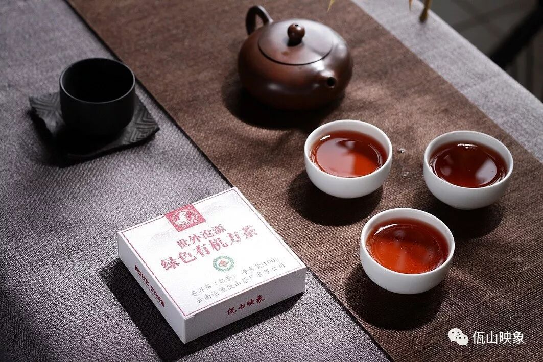 有機(jī)方茶熟普,紅褐而又有光澤的外形,顯示了其良好的發(fā)酵程度。其湯色亮如紅葡萄酒,隱泛有光澤。聞香一縷,是陳香馥郁。入口,滋味醇厚潤滑,溫潤怡人,口感層次豐富協(xié)調(diào)。