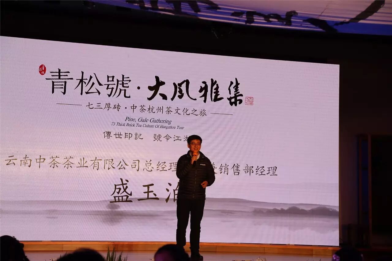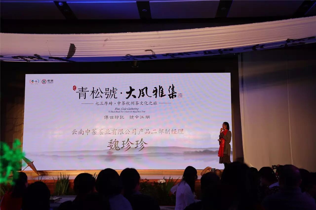 茶博風(fēng),漸起。云南中茶盛玉泊經(jīng)理為來賓們介紹了從13年以來云南中茶的發(fā)展;魏珍珍經(jīng)理則用32個字準(zhǔn)確總結(jié)與定位了這一款新品七三厚磚——